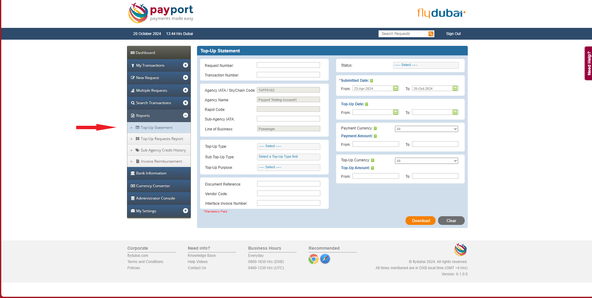 Top-up Statement gives details for all the Top-up transactions about your Travel Agency, based on the criteria defined.